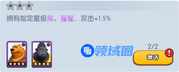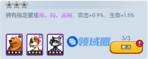 拥有指定星级熊、狗、浣熊,攻击+0.9%,生命+1.5%