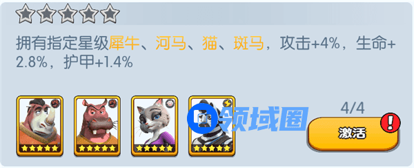 拥有指定星级犀牛、河马、猫、斑马,攻击+4%,生命+2.8%,护甲+1.4%