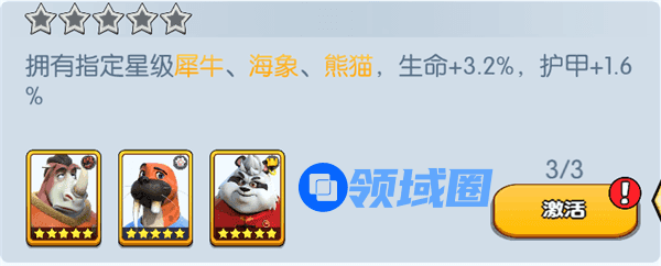 拥有指定星级犀牛、海象、熊猫,生命+3.2%,护甲+1.6%