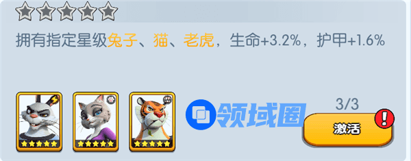 拥有指定星级兔子、猫、老虎,生命+3.2%,护甲+1.6%