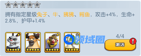 拥有指定星级兔子、牛、狒狒、鳄鱼,攻击+4%,生命+2.8%,护甲+1.4%