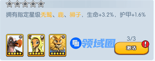 拥有指定星级秃鹫、鹿、狮子,生命+3.2%,护甲+1.6%