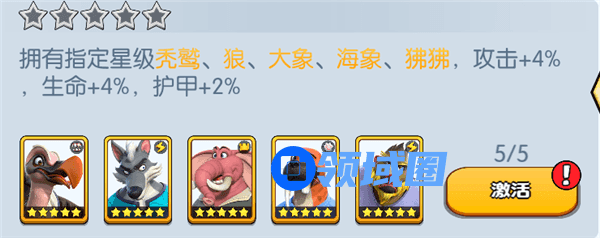 拥有指定星级秃鹫、狼、大象、海象、狒狒,攻击+4%,生命+4%,护甲+2%