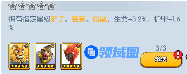 拥有指定星级狮子、狒狒、凤凰,生命+3.2%,护甲+1.6%