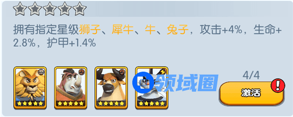 拥有指定星级狮子、犀牛、牛、兔子,攻击+4%,生命+2.8%,护甲+1.4%