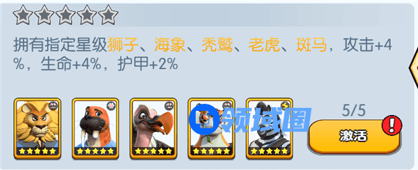 拥有指定量级狮子、海象、秃鹫、老虎、斑马,攻击+4%,生命+4%,护甲+2%
