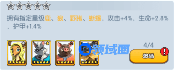 拥有指定星级鹿、狼、野猪、蜥蜴,攻击+4%,生命+2.8%,护甲+1.4%