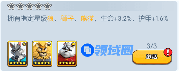 拥有指定星级狼、狮子、熊猫,生命+3.2%,护甲+1.6%