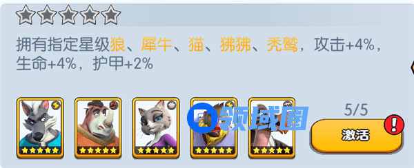 拥有指定星级狼、犀牛、猫、狒狒、秃鹫,攻击+4%,生命+4%,护甲+2%