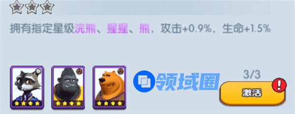 拥有指定星级浣熊、猩猩、熊,攻击+0.9%,生命+1.5%