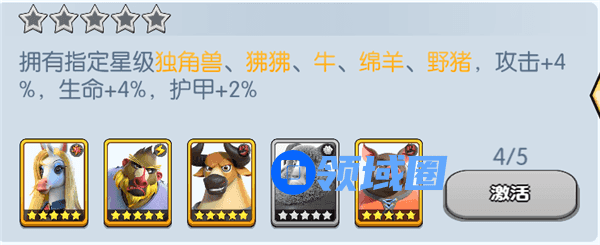 拥有指定星级独角兽、狒狒、牛、绵羊、野猪,攻击+4%,生命+4%,护甲+2%