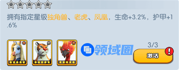 拥有指定星级独角兽、老虎、凤凰,生命+3.2%,护甲+1.6%