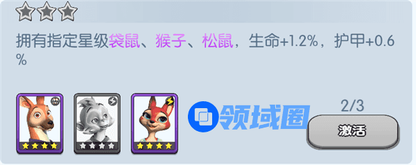 拥有指定星级袋鼠、猴子、松鼠,生命+1.2%,护甲+0.6%