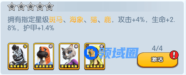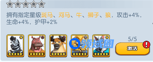 拥有指定星级斑马、河马、牛、狮子、狼,攻击+4%,生命+4%,护甲+2%