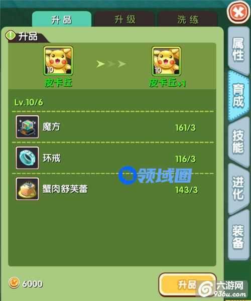 选择自己想要强化的宠物(这里小编就用自己最喜欢的皮卡丘为大家进行示范)再点击右侧菜单的育成按钮就可以看到升品界面~