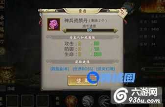 在神兵升级到三阶后,可以开启神兵资质系统。神兵阶数越高,资质等级上限越大。使用神兵资质丹可以升级神兵资质,神兵资质升级后会增加固定属性,同时增加人物属性。