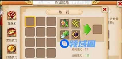 100%得到一个对应三级药材料所属列表中的随机一个三级药; 列表1 列表2 列表3 列表4 金香玉 九转回魂丹 千年保心丹 金香玉 十香返生丸 五龙丹 小还丹 风水混元丹 佛光舍利子 定神香 蛇蝎美人 红血散 (3) 使用新配方炼药活力消耗不变,最高40点,作为材料的三级药品质必须大于10。