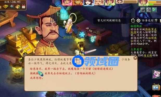 1、秘境迷宫一层:挑战两个特处士(随机坐标),都是牛妖造型。两个特处士一个是高攻高速低血,另一个是低攻低速高血。建议先杀左右角,最后杀主,因为主怪的左右角会杀主怪胜后找秘境散仙(随机坐标)传到下层。