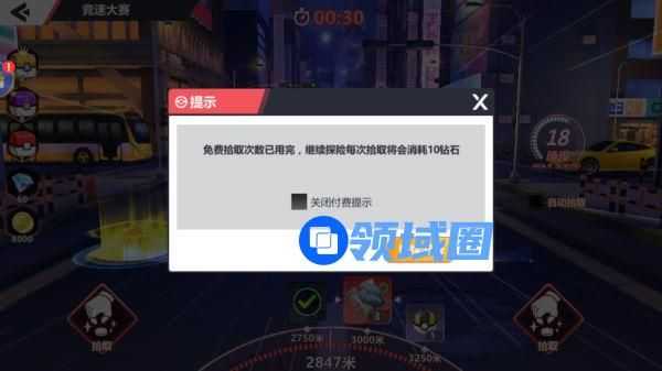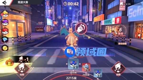 3、竞速大赛中,每次都会有一分钟的时间,需要在一分钟以内尽可能的拾取道具,拾取的道具越多,速度也越快,跑的距离也就越长。会有喷火龙挡在你的面前,抓住时机打到它,否则会损失大量速度!免费的拾取次数有25次,如果超过了就要用钻石拾取,但是丰厚的奖励只要一点钻石又何妨呢?