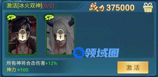 属性:所有神将合击伤害+12%,神力+100