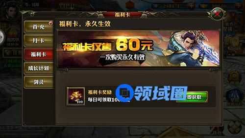 2、福利卡(60元):与月卡类似,但是比月卡厉害,因为这个是没有月卡30天限制的,只要玩家购买了,只要游戏不关服,每天进入游戏都能获得100元宝,是性价比最高的。