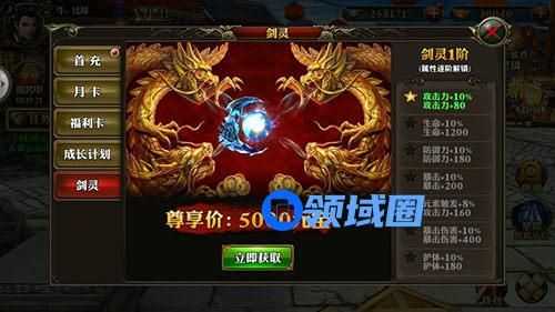4、剑灵(50元):这个道具非常给力且永远不会过时,因为它是根据玩家自身属性的百分比增加属性的,玩家的属性越高,获得的增幅就越大。当然,这个只有开服前期才那么便宜,过了活动就需要5000元宝购买了,这样很不划算。所以剑灵越早买越好。