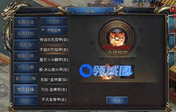 3、可将装备进行性别转换,将需要转换的装备+进化之石放入合成即可