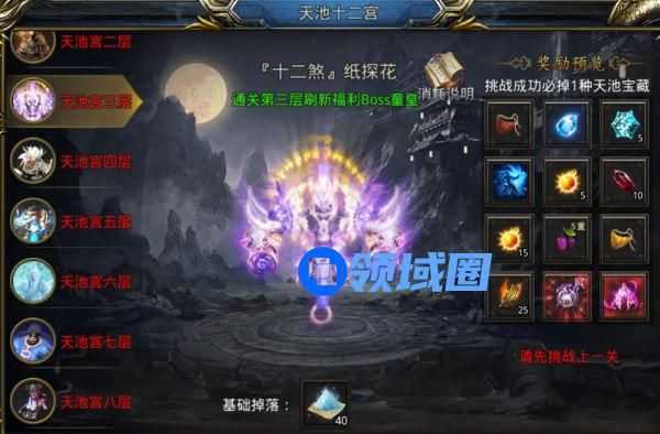 天池十二宫一共12层,每层分别由对应的天池杀手所镇守,成功击杀后将获得大量稀有物品和材料。通关三层后额外刷新十二煞之首-童皇,击杀可爆出大量荣誉印章。