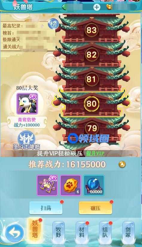 2、妖兽塔,妖兽塔共1000层,玩家通关对应妖兽塔层数,可获得对应的萌宠奖励,玩家每日可扫荡1次妖兽塔,获得已通关层数的扫荡奖励,VIP玩家达到战力要求时,可直接碾压妖兽塔层数