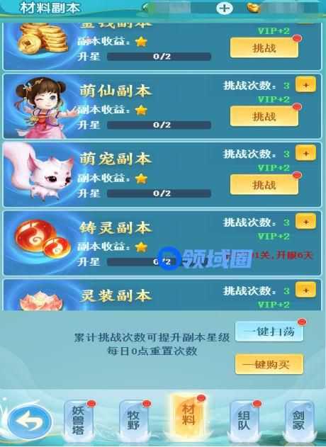 4、材料副本:共计5种材料副本,分别对应金钱、萌仙、萌宠、铸灵、灵装,玩家每日可挑战1次材料副本,升级VIP最多可额外增加2次挑战次数,每日可消耗仙玉购买1次挑战次数,挑战材料副本可累计星数,每次挑战可积累1星,副本星数可提高副本收益,周末挑战材料副本,收益翻倍