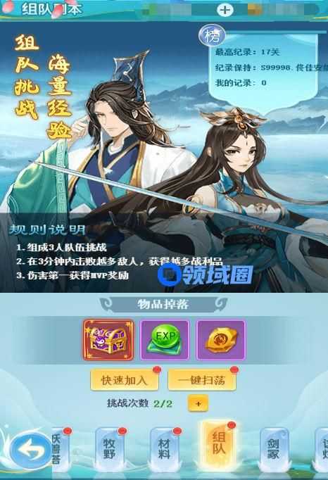 5、组队副本:组成3人队伍挑战,在3分钟内击败越多敌人,获得越多战利品,伤害第一获得MVP奖励,规定时间内击杀boss,可直接跳关,玩家每日可挑战2次,可消耗仙玉额外购买1次挑战次数,每日可一键扫荡组队副本,获得通关关卡数的扫荡奖励