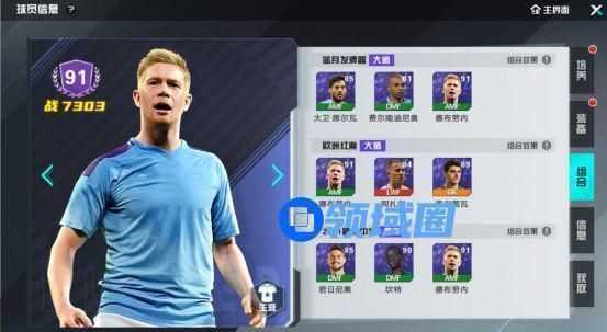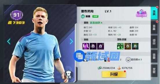 德布劳内球员评分为91,1级战力为7303。初始卡面品阶为联赛球星,可通过突破方式将他进阶到最高阶的世界球王,定位为前腰。