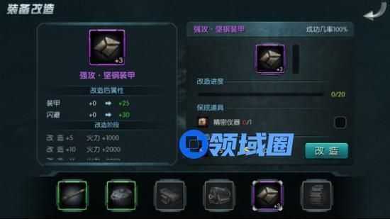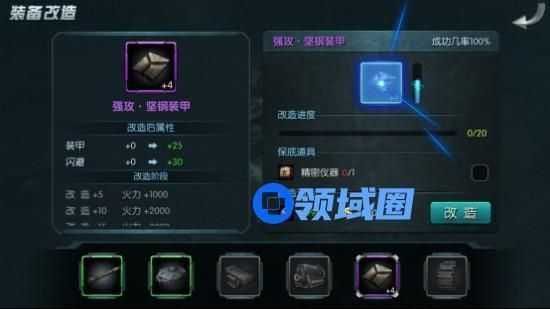 装备的改造相对来说比较复杂,但可以对装备带来极大的提升。装备改造后,在原来的固有属性之外,会带来新的属性加成,随着改造等级的提升,加成的属性值越来越高。不同部位的装备改造后获得的额外属性并不是随机生成的,而是根据装备部位的不同,系统给定的。比如:所有的观察镜在改造后,都将获得破击和防护2个额外属性。