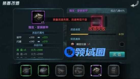装备改造时,成功率是随着改造等级的提升而降低的,因此会发生失败的概率,并且失败后有可能会造成改造等级下降。对于高改造等级装备的再次改造,我们建议玩家使用改造的保底道具——精密仪器,它可以确保改造失败后改造等级不降低。精密仪器在商城有售,同时完成每日任务的玩家可以从奖励中获得。