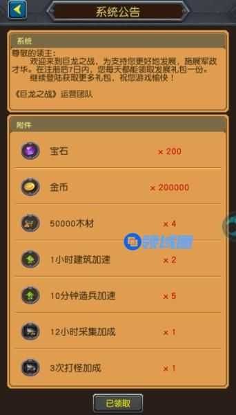 巨龙之战新服的玩家在注册后7日内,每天都能领取发展礼包一份。礼包内容包括金币、木材、各种加速道具、采集打怪加成道具等,最为重要的是礼包每天都包含200宝石。有了每天200宝石的发展礼包,相信不少玩家都能在前期得到良好的发展。