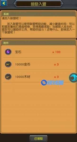 巨龙之战游戏前期会以邮件的方式提醒玩家加入联盟,鼓励入盟邮件中含有100宝石。玩家加入联盟后也会有加入联盟奖励,总共有500宝石,会以宝石包的形式通过邮件发放到玩家包裹里。