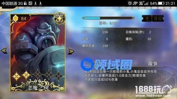 每2秒自动召唤一只较弱的小鬼,小鬼会自动冲向周围敌人,自爆并造成物理伤害,对建筑只造成50%伤害。