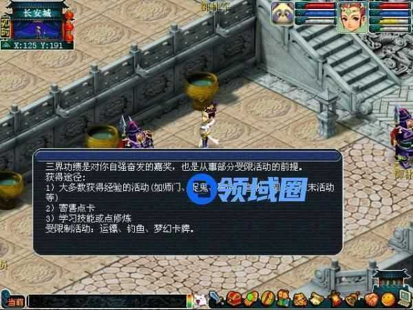 到长安(120,190)NPC善赏恶罚处可以查看当前的三界功绩值。每个角色31级~55级,每升1级获得20点功绩。三界功绩上限为6000。