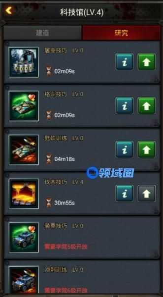 在城池建筑点击科技馆,可以进入科技面板,如图,在此建筑中玩家可以查看自己已经研发了的科技,通过科技可以提升部队的生命、攻击等,也可以研发城市发展的科技,加速自己城市的建设。