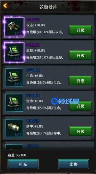 在城内建筑点击军械所,可以进入军械界面,如图,玩家可以将在军械探险副本得到的军械升级工具卡和升级。军械可以升级,升级将会提高自身属性,升级需要消耗其他军械或军械卡,玩家没有使用的军械和军械卡都存放在军械所的仓库之中