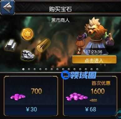 玩家可在购买宝石界面中查看黑市商人,黑市商人每天会提供随机量的资源礼包,玩家可使用龙晶进行兑换。每种礼包每天限购一定次数,购买一个后会出现之后的一个,直到次数用光为止。目前龙晶在游戏中仅能通过充值进行购买。