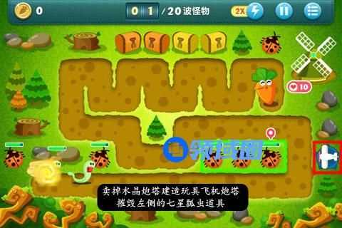 卖掉水晶炮塔建造玩具飞机炮塔,摧毁左侧的七星瓢虫道具。