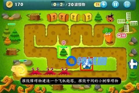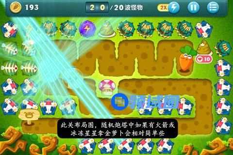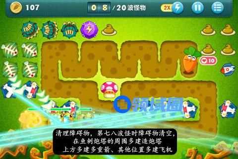 初始金钱140,可建造炮塔魔法球炮塔、多重箭炮塔、太阳炮塔、星星炮塔、飞机炮塔。关键12、16波小怪多加注意,先在鱼刺周围建造炮塔、上方建造多重箭。