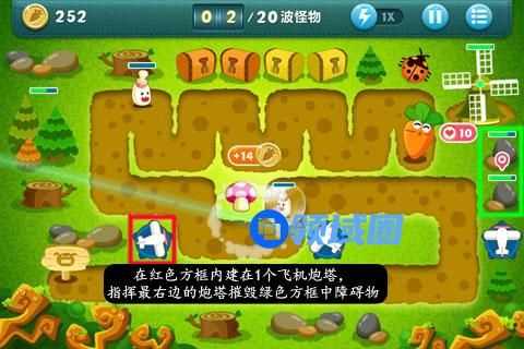 在红色方框内建造一个飞机炮塔,指挥最右边的炮塔摧毁绿色方框中的障碍物。