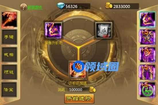 装备到达紫色+7或橙色+9可以进行装备进阶升级,进阶后颜色外貌发生变化,并且增加装备属性。