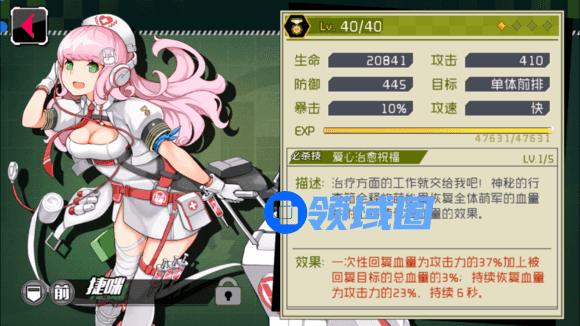 捷咪,全双马尾目前唯一一个奶妈 血量很足防御一般 ,没有什么攻击力。因为是奶妈吗?至于技能没升满只能瞬间回780的血量(升满了听说能瞬间回几千)。看上去并不可观,但奶妈算上技能给自己加血的话存活属性中上,技能适合永动,先灭中后故意留前排盾,慢慢打拖时间补血,技能更大作用是为了保护后排。