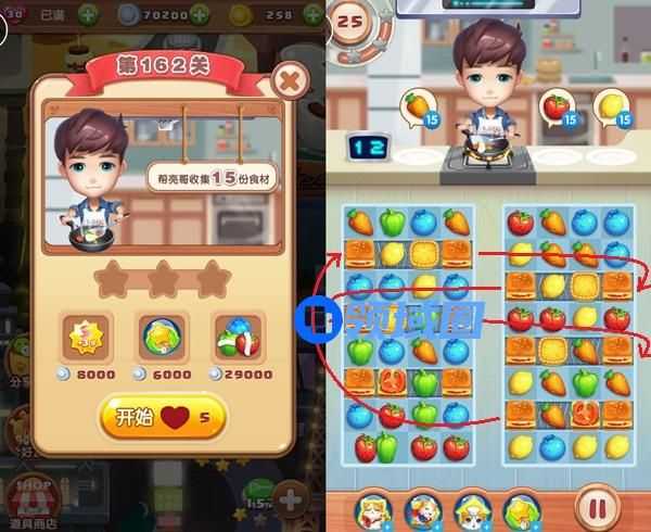 关卡越往后,食材收集越是数量庞大,这次辰辰的关卡要收集多达170片饼干。本关第一眼看起来没有太过夸张的道具,但正是这种不大不小的分割地形特别难凑出高级炸弹食材,搭配所需食材的巨量收集数简直让人欲仙欲死!特别是每块地形中央都有一块障碍食材使得连消非常不方便,如果优先消除障碍物往往又会导致后期步数不够用,这种难熬的关卡让人相当难受!