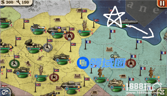 等一个回合后,西边开始疯狂爆菊。从二级工业城征召装甲车,如果可能,直接偷掉四级城。但一般还是会受阻。所以往下抢占一级城。在空的地块建一个一级工业城,再征召个装甲车,东进偷地。注意,这时候得有一部分靠东边近的部队开始东进援救指挥官部队了。南部各种花式抄地,主力部队收拾完四级城附近的残敌后迅速东进,寻找朱可夫主力部队作战。一般都是在画叉圈处全歼朱可夫部队。注意,你的航母在整个过程中都要在原属法军的开罗港支援法军,切记不可让苏军突破法军残破的防线。来一个打一个。