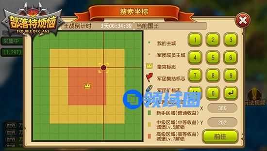 其次,在整个大地图上共分为3种地块:绿色的新手区域,普通资源收益;黄色的中级区域需要城堡5级解锁,里面资源中等;而橙色部分就是资源丰富的高级区域,城堡达到7级才能解锁,而且中心地带为王宫,是所有领主的目标,毕竟大家都想努力成为国王嘛!我们可以通过界面下方的坐标来搜索主城周围散布的资源地块,有选择的掠夺金币和钻石资源,从而增强实力。