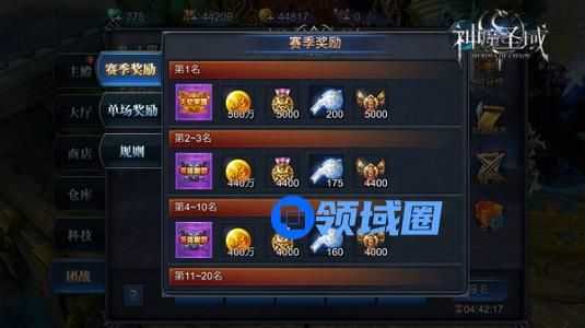 每个赛季积分上榜的军团都会拥有赛季奖励,第一名的军团可以获得“天使军团”徽章,并且奖励500万金币,5000荣誉,200个银口哨,5000军功。荣誉可以在商城换取宝物,银口哨可以训练幻兽,军功可以在军团商城和仓库换取装备。